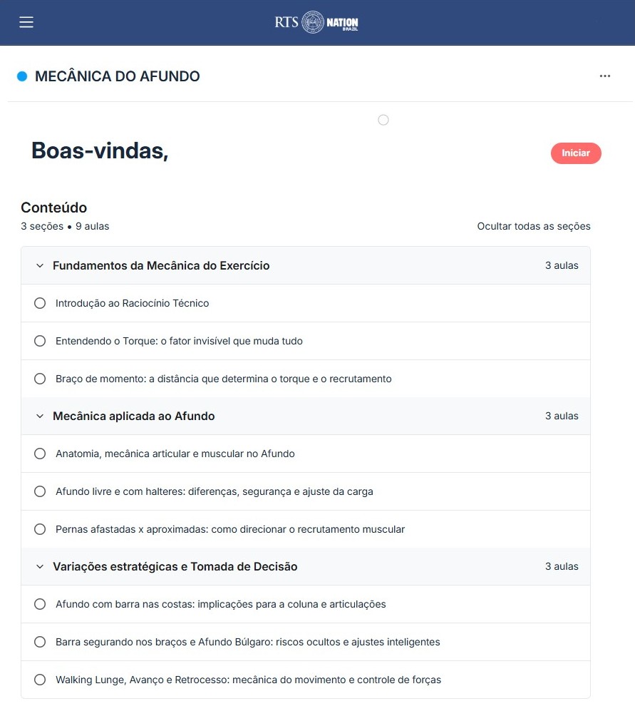O curso fica disponível imediatamente na plataforma RTS Nation — o ambiente criado pelo RTS para discussões técnicas sobre ortopedia aplicada aos exercícios resistidos.